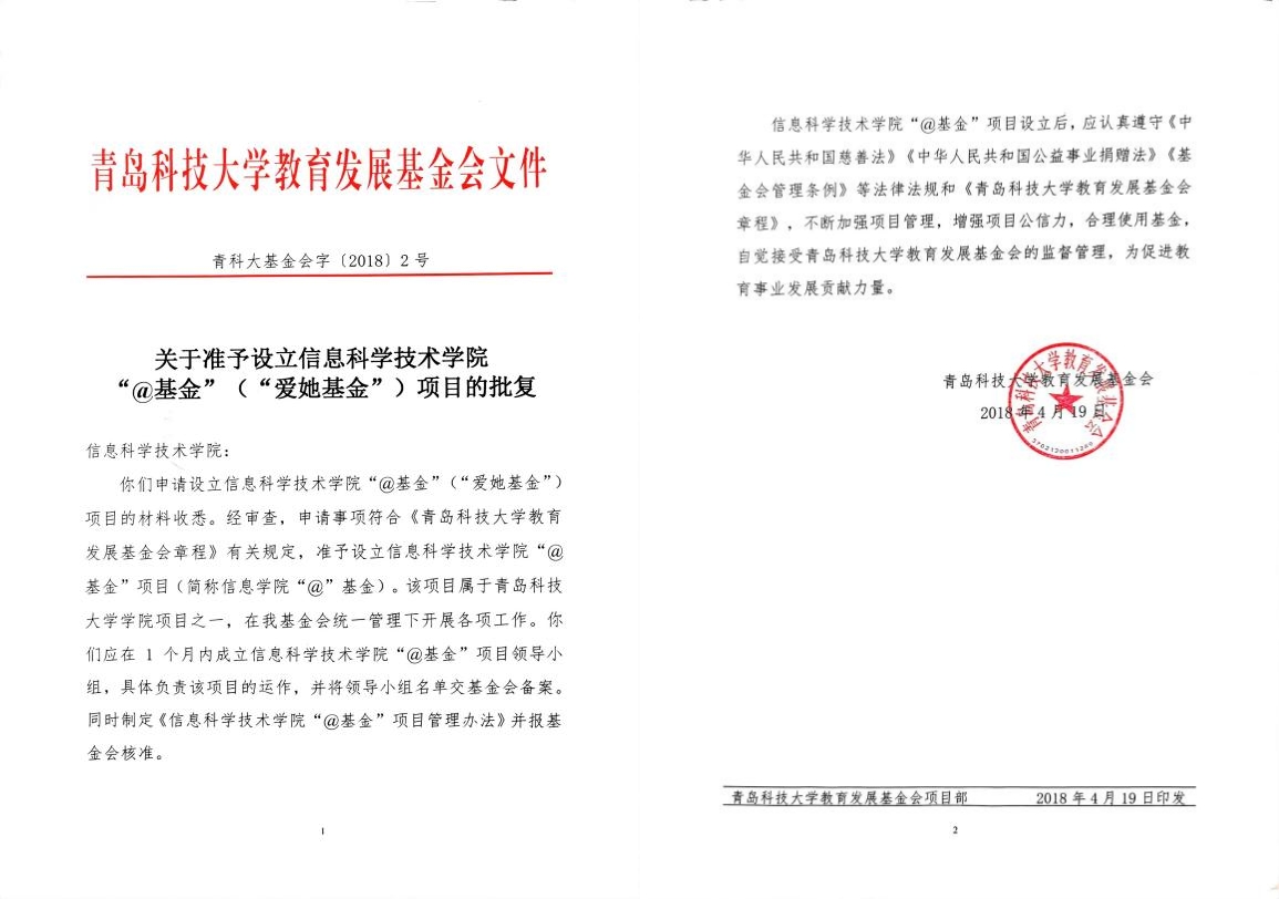 2018年4月19日,经学院申请提交“@基金”(“爱她基金”)项目材料,学校教育发展基金会同意设立350vip浦京集团官网“@基金”(“爱她基金”)项目(简称350vip浦京集团官网“@”基金)。学院立即成立“@基金”项目领导小组,负责“@基金”项目的运行,并将领导小组名单提交学校基金会备案。同时制定《350vip浦京集团官网“@基金”项目管理办法》并报学校基金会核准。